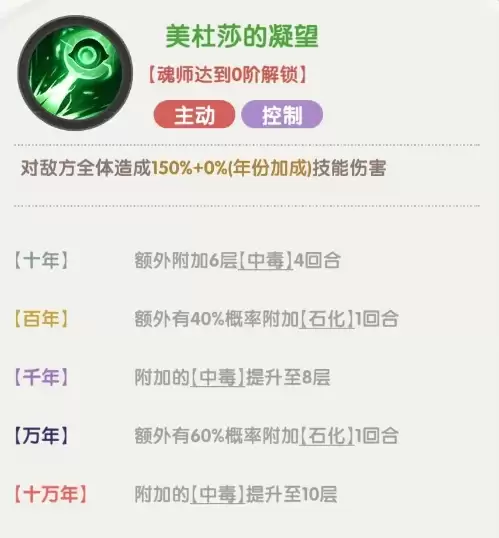 独孤博的主动技能“美杜莎的凝望”,能对敌方全体造成技能伤害;通过提升魂环年份,还可额外附加中毒与石化效果。目标中毒后,每层都会造成2%最大生命值的持续伤害,叠加起来的效果相当可观;石化则能让对手无法行动。若装备十万年魂环,无论是毒伤层数还是石化概率都会显著提升,这正是独孤博出场率极高的关键——他是一位集群体控制与持续伤害于一身的战术型魂师。