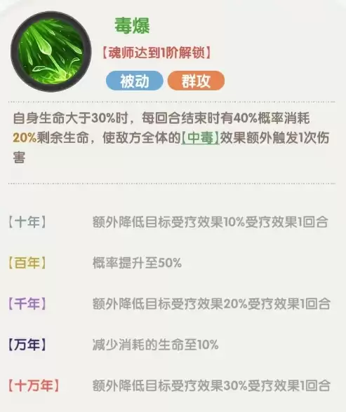 第1个被动技能“毒暴”,当独孤博生命值大于30%时,每回合结束有概率消耗自身血量,使敌方全体中毒效果额外触发一次伤害;提升魂环年份后,还能额外降低目标的受治疗效果。在削减治疗能力后,对方辅助角色几乎难以发挥应有的续航作用,这对付持久战或生存流阵容尤为克制。