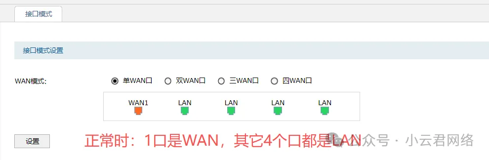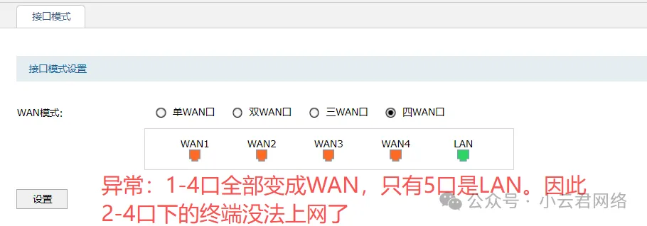 客户单位采购了一台某品牌路由器作为互联网出口设备。用户近期发现,该设备的WAN口模式会不定期自动切换:初始设置的单WAN口在运行一段时间后,竟会自行变为多WAN模式,造成LAN口下连设备出现网络中断: