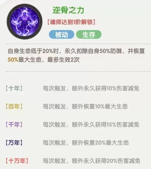 第一个被动技能“逆骨之力”在古榕生命值低于20%时触发,将牺牲自身50%的永久防御,以换取恢复50%最大生命值的效果,此效果最多生效两次。此外,每次触发该效果时,还能获得额外的伤害减免和额外的最大生命值恢复这两项属性。总体来看,这是一个通过牺牲防御来换取生命值的技能,在前期可能不算特别划算,但在战局后期,当角色残血时,血量的重要性就凸显出来,再加上高魂环附加的伤害减免,使得古榕在前排承担伤害时拥有更大的生存与发挥空间。