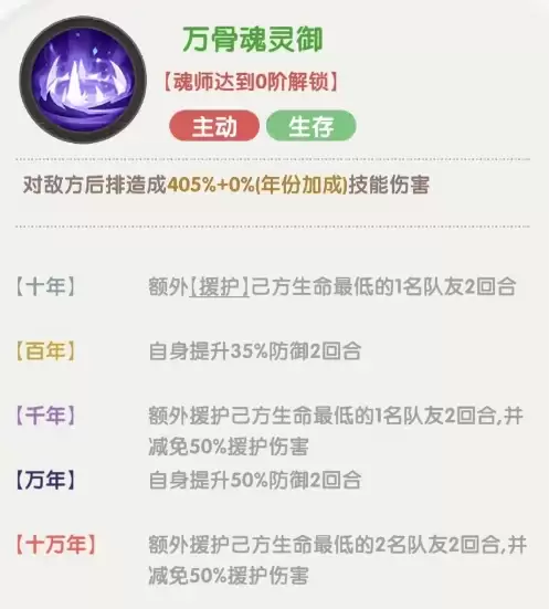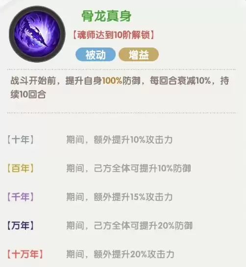 最后一个被动技能,在战斗开始时直接提升100%的防御,之后每回合衰减10%。提升魂环后还有额外的攻击力提升效果。这个被动非常强势,尤其是在应对开场爆发流的阵容时,可以让我方前排更好地承担住第一波伤害,再配合自身的其他被动,能够在场上存活很长时间。