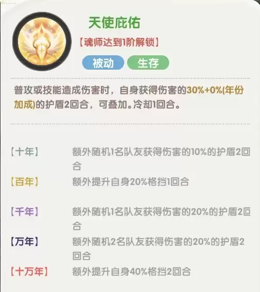 天使真身:开局为自身及两名队友提供护盾,并永久提升全队伤害减免,在十万年魂环加持下减益效果尤为显著。