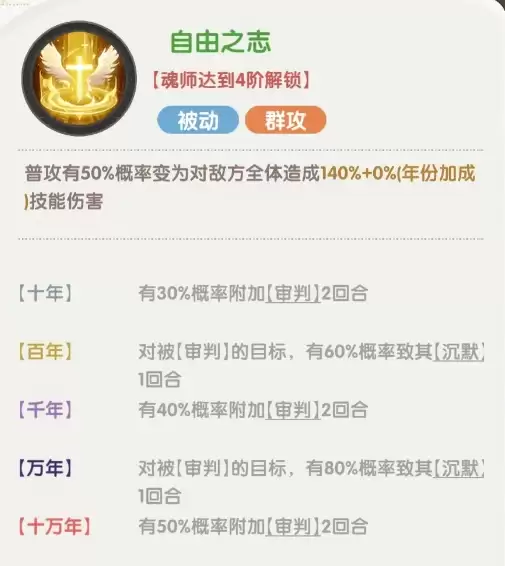 自由之志:普攻概率转化为群体伤害,并附加【审判】与【沉默】效果,有效限制敌方技能释放;