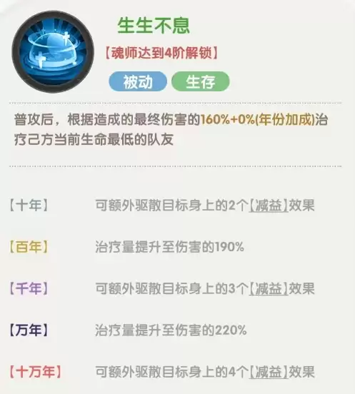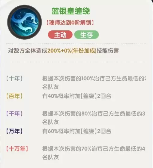 主动技能“蓝银皇缠绕”:根据魂环年份提供不同效果,包括群体伤害、多目标治疗及概率缠绕控制,十万年魂环更能同时治疗四名队友。