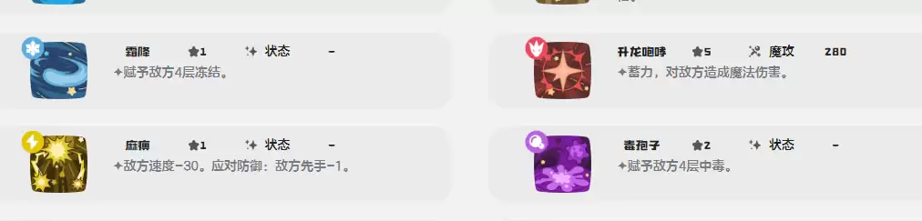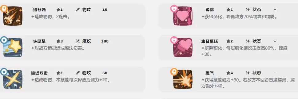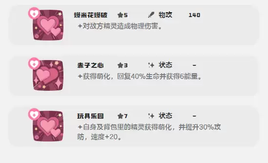 休息恢复能够直接回复30%的生命值,在日常对战中完全够用。更厉害的是它还有个应激反应,通常情况下可以恢复约25%的血量,若是遭遇对手的防御反击,就能瞬间回复80%的生命值。在残血反击的关键时刻,这个技能往往能扭转战局。另外还有个赤子之心,不仅能回复40%的生命值,还可以获得6点能量。整体性价比相当出色,除此之外,增益技能也是它的主要亮点之一。柔弱可以降低敌方70%的物理攻击和物理防御,这为我方创造了更多输出空间。
