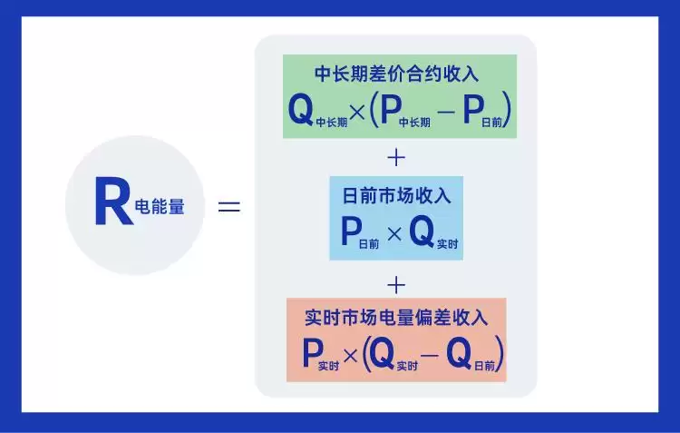 按照《电力现货市场基本规则(试行)》要求,R电能量= Q中长期 × (P中长期 − P日前) + P日前 × Q日前+ P实时 × ( Q实时 − Q日前)。即发电企业的电能量收益(即卖“电”的钱)由三部分构成:中长期差价合约收入、日前市场收入及实时市场电量偏差收入的部分。