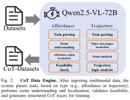 研究团队首先需要高质量的教材,也就是带有清晰思考过程的训练数据。他们构建了一个名为VLA-CoT-13K的数据集。他们使用强大的Qwen2.5-VL-72B模型,为13000个任务场景自动生成了中间的推理步骤。