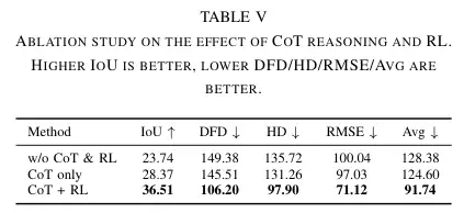 结果如表所示,每一步的改进都清晰可见。单独加入CoT,就能让模型的定位精度(IoU)从23.74提升到28.37,这说明思维链对于帮助模型理解属性、消除歧义至关重要。而当CoT和RL结合后,所有指标都获得了巨大提升。这完美地证明了两者是互补的:思维链提供了结构化的任务分解和推理框架,而强化学习则利用精细的奖励信号来打磨和完善具体的执行策略,最终实现了1+1>2的效果。