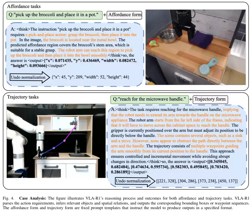 在这些充满不确定性的真实环境中,VLA-R1再次证明了自己。在可供性感知任务上,它的平均成功率约为62.5%,在轨迹预测任务上,平均成功率高达75%。而基线模型NORA-3B在这两项任务上的成功率分别只有35%和47.5%。研究团队发现,颜色相近、位置变化等因素是导致错误的主要原因。即便如此,VLA-R1在失败的情况下,其预测也通常集中在目标物体附近,而不是完全离谱,显示出了一定的容错和自我纠正能力。