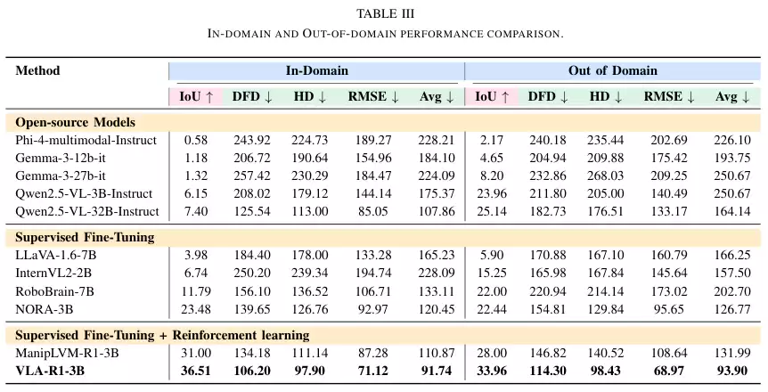 接着是更具挑战性的领域外(Out-of-Distribution, OOD)泛化能力测试。模型需要处理它在训练中从未见过的数据。结果显示,VLA-R1的优势更加明显。在可供性任务上,它的IoU达到了33.96。在轨迹预测任务上,三项误差指标甚至比领域内测试时还要低。这证明VLA-R1学到的不仅仅是死记硬背训练数据,而是真正掌握了可泛化的推理能力。