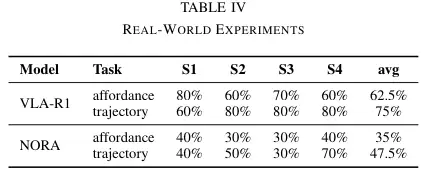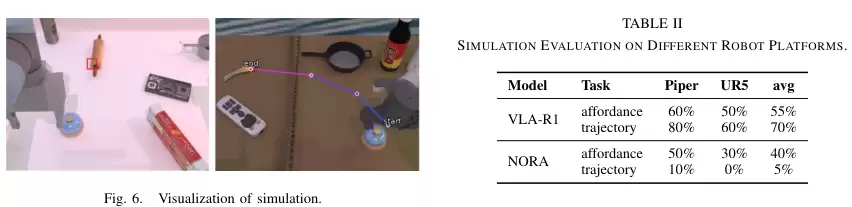 尽管模拟环境的变化比训练数据更大,VLA-R1依然表现出色。在可供性感知任务上,它的平均成功率(Success Rate, SR)为55%。在轨迹执行任务上,平均成功率更是达到了70%。相比之下,基线模型NORA的表现则差很多,尤其是在轨迹任务上,几乎完全失败。这证实了VLA-R1在动态变化的环境中,依然能保持强大的稳定性和泛化能力。