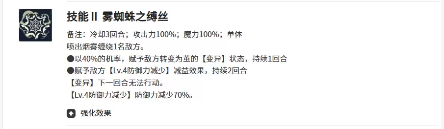 第二个技能"雾蜘蛛之绢丝"需要冷却三个回合后才能再次使用。这个技能提供的攻击力和魔力加成比例均达到100%,同样是对单体敌人进行输出。此时内布拉会向目标喷出一段烟幕,这个烟幕有40%的概率使目标陷入"变异状态",也就是直接将敌人转变为莲藕。在后续回合中,只要敌人保持这种莲藕状态就无法行动。此外,该技能还会根据敌方防御值最低的单位作为目标,带来70%的防御减免效果。这个减防效果会持续生效两个回合。