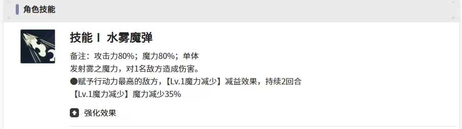 作为夏尔法家的长女,内布拉不仅是大鹫团团长诺吉尔的妹妹,同时也是以诺艾尔姐姐的身份登场。在游戏剧情中,她是一位性格非常强势的角色,行动能力也完美契合了这种强势特质。在技能配置方面,她的第一个技能"水雾魔弹"在发动时,攻击力和魔力值都会达到80%的加成比例,且专门针对单体敌人进行输出。施放时,她会发射自身的物质魔力对敌人造成伤害,之后还会赋予当前行动力最高的敌方单位一个减益效果——使其魔力值减少35%。这个效果会在接下来的两个回合中持续影响目标。