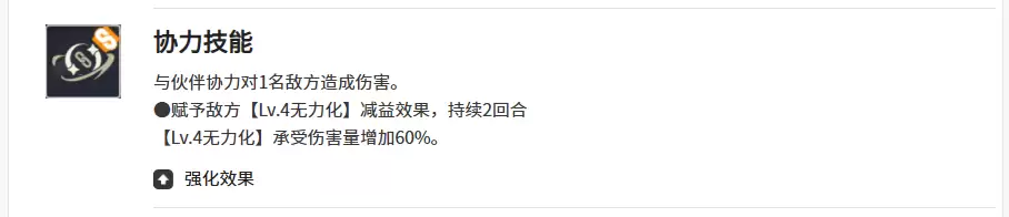 这个效果的具体表现是:当内布拉使用"水雾魔弹"时,会有两个分身直接出现,对敌人造成150%的额外伤害。分身效果会在场上持续存在两个回合,所以整体输出比例还是相当可观的。如果大家想要发挥好内布拉的协力技能,一定要和队友配合上场。此时与同伴协力就可以对一名敌人造成输出,虽然在输出数值上不算很高,但可以赋予敌方一个无力化的减益效果。无力化实际上可以让目标承受的伤害量增加60%,同样持续两个回合。因此这个协力技能相对来说,完全可以当作一个增益技能来使用。