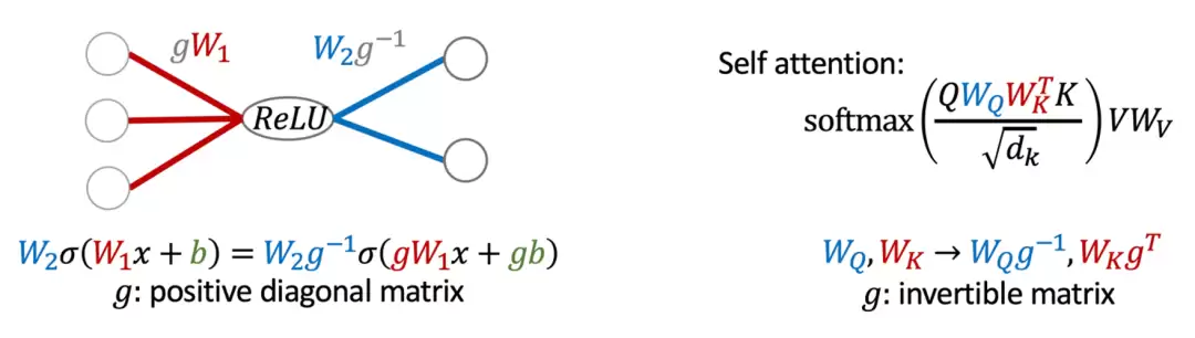 图2:(左)ReLU网络的缩放对称性:对输入权重与偏置按对角矩阵g进行缩放,同时对输出权重乘以g的逆矩阵,函数关系保持不变。(右)自注意力机制的一般线性对称性:键(WK)与查询(WQ)的线性变换g可以互相抵消,输出结果不变。