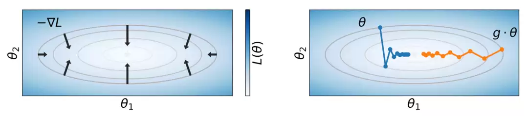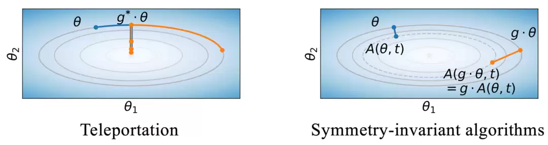 这种“等损失、不同梯度”的现象为算法设计带来了新的思路。部分优化方法尝试在等价轨道中主动寻找梯度更优的点,以加速收敛或改善最终解的质量(图5左);另一些方法则追求对参数初始点的对称变换不敏感,让优化结果对初始条件具有更好的鲁棒性(图5右)。