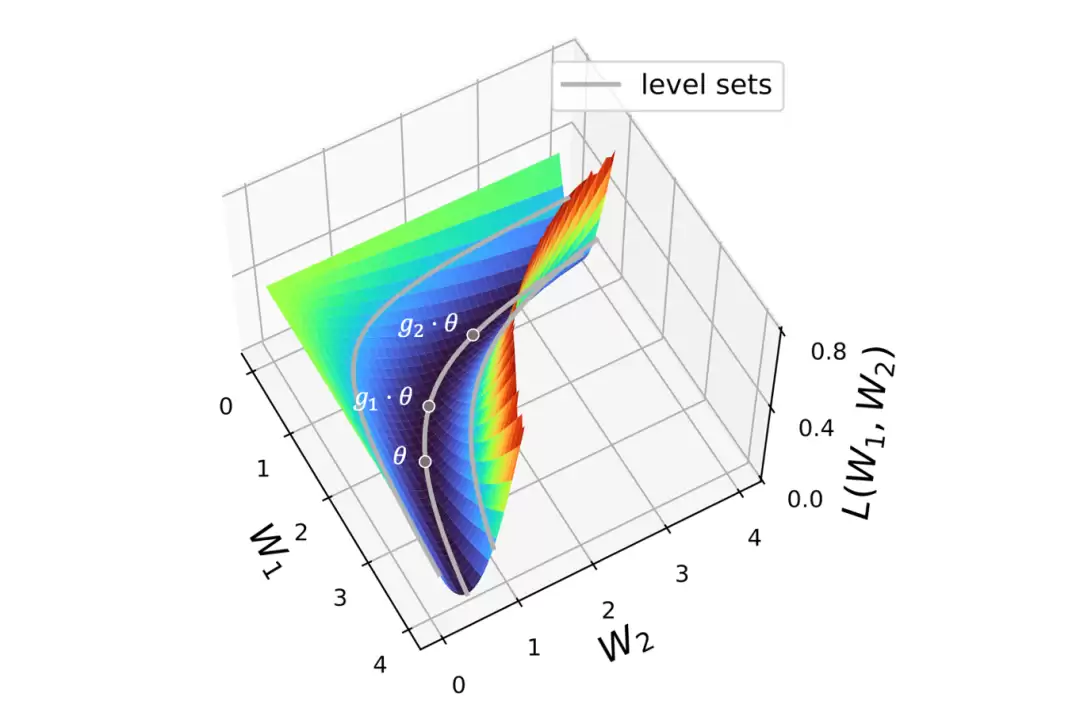 图3:连续对称性与平坦极值:不同的参数θ,g1·θ,g2·θ拥有相同的损失值,构成一条由对称变换生成的平坦优化轨迹。