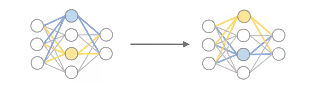 图1:置换对称性示意。交换隐藏层中两个神经元及其关联的权重参数,函数输出保持不变