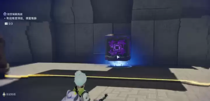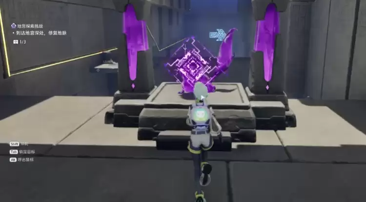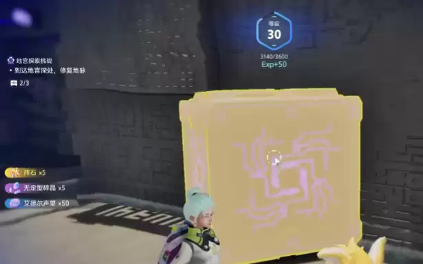 首先进入的是“腾云驾雾”地宫场景,想要打开宫门需要先完成门口的导电机关。将紫色电箱推到左侧的普通木箱处,使电路成功连接。位于远处的电箱位置对应第一个宝箱,如果电箱摆放不到位,电路就无法导通。玩家可以反复调整位置,直至整个电路连通,大门便会自动开启。进入大门后向左走,爬上柱子旁的石台,会看到一块悬浮的石板。站上石板即可向前移动,到达紫色球体附近时按下交互键为其供电,待移动平台抵达后纵身跃上,跟随平台继续前进,即可进入下一个探索区域。