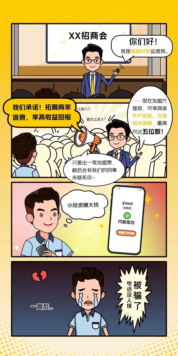 例如:“美团800元外卖尊享体验卡”“交钱就能成为闪购代理商”“无资质也能入驻小象供应商”“注册无人配送可获现金返还”“鸭鸭线上探店招募”等。