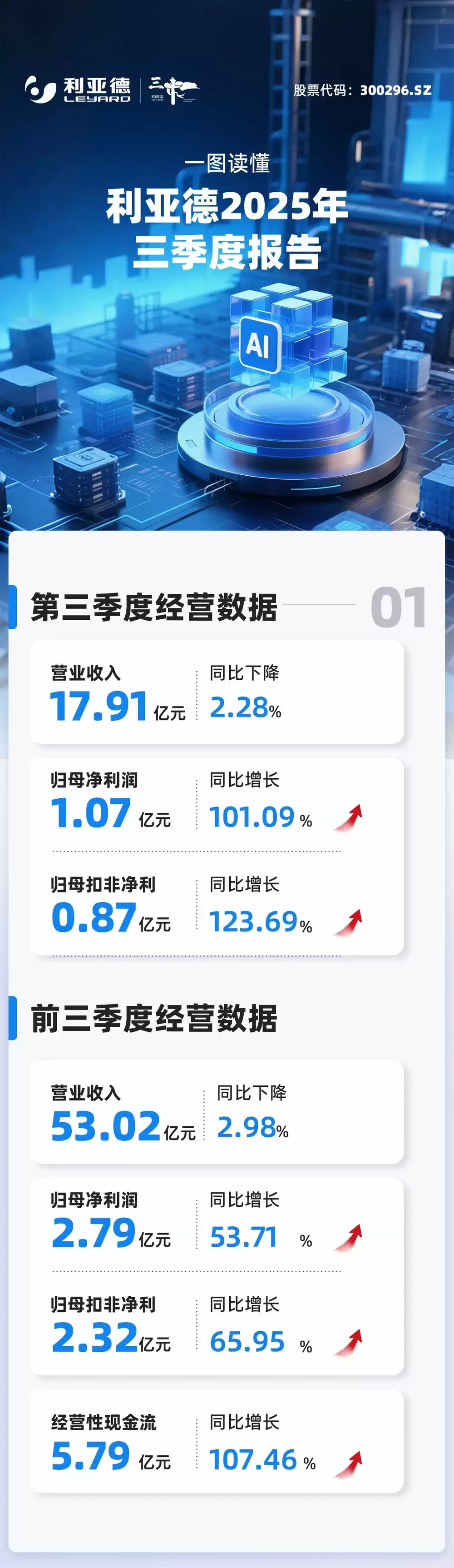 10月30日消息,10月30日,利亚德发布第三季度报告。报告显示,第三季度利亚德营业收入为17 91亿元,同比下降2 28%;归母净利润为1 07亿元,同比增长101 09%。前三季度,利亚德营业收