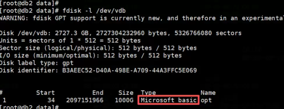 正常情况下,执行这条命令后,/dev/vdb的所有剩余空间应该扩展到/dev/vdb1分区。但现在出现了报错,似乎是分区表存在冲突,还提示有数据丢失风险,顿时让我认真了起来。