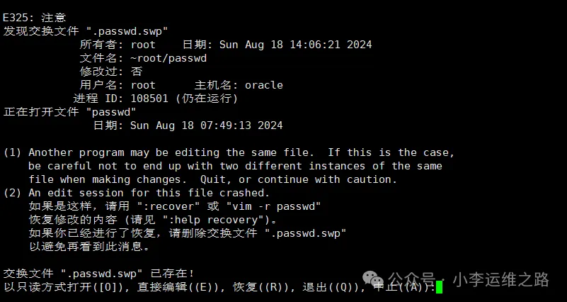 直接删除自动生成的临时文件 file.swp,或在报错界面输入 D 放弃编辑操作。