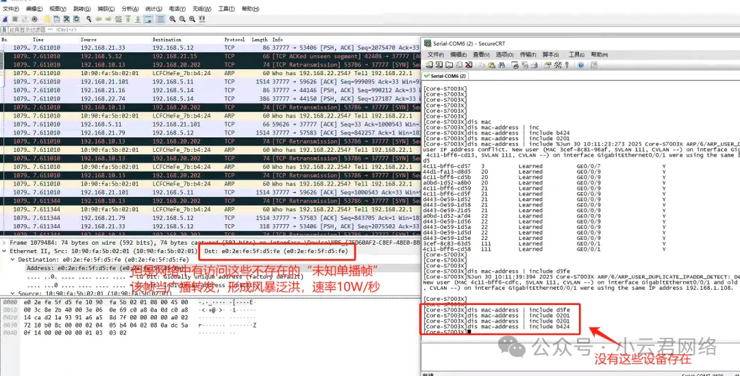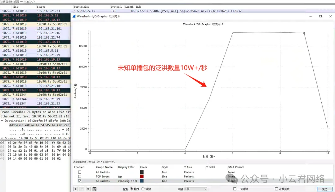 (1)在三个业务VLAN中检测到大量未知单播帧形成的广播风暴,这些数据包的目标地址都是网络中实际不存在的MAC设备,整体泛洪量达到每秒10万以上,导致业务完全瘫痪;