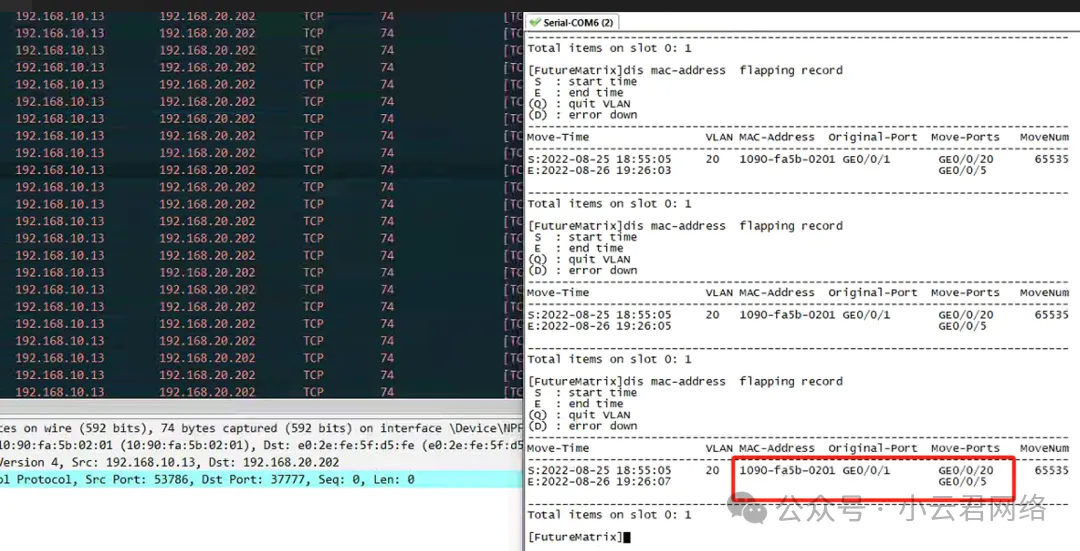 (3)为了验证这个推测,我们直接在汇聚交换机上查看MAC地址漂移记录即可,相关命令:dis mac-address flapping record