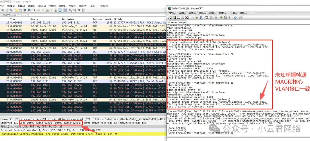 (2)未知单播帧被当作广播帧转发虽然是正常现象,但数量如此庞大确实异常。很可能存在一种情况——这些未知单播帧在传输过程中形成了回环风暴。进一步检测发现,泛洪的未知单播帧源MAC地址为0201,这个地址正是核心交换机的物理地址: