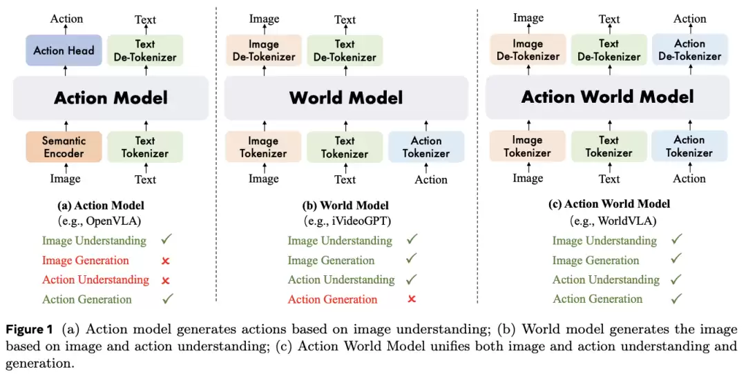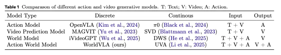 VLA模型:基于预训练的多模态大语言模型构建,虽具备跨场景任务泛化能力,但仅将动作作为输出端,未能深度整合为输入进行分析,缺乏对动作意图的全面理解。世界模型:能够基于当前观测和动作序列预测未来视觉状态,理解视觉信息与行为动态,但无法直接生成具体动作,在需明确动作规划的智能化场景中应用受限。