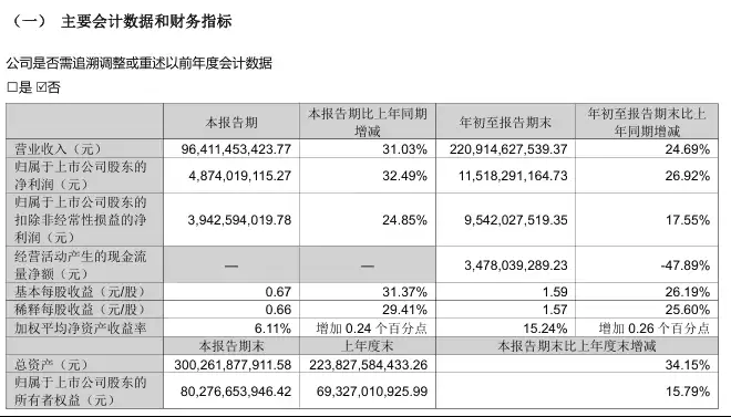 从公告中获悉,该公司前三季度累计营业收入达2209.15亿元,同比增长24.69%;归属上市公司股东的净利润为115.18亿元,同比提升26.92%;基本每股收益1.59元。