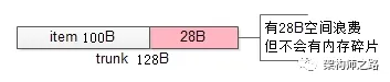 拿到一个128B的chunk,去存储一个100B的item,剩下的28B不会被其他的item所使用,即:实际上浪费了存储空间,来减少内存碎片,保证访问的速度。