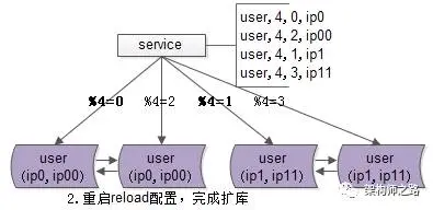 修改配置(双虚拟IP与微服务数据库路由);reload配置,实例倍增完成;删除冗余数据等收尾工作,实现数据量减半。