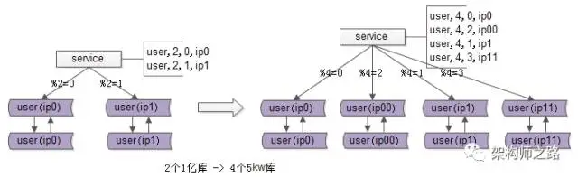 新的问题随之而来:分成n个库后,随着数据量的进一步增加,需要扩容至2*n个库。如何在不中断服务的情况下实现数据平滑迁移,保证服务持续可用?