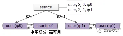 如上图所示,用户库user被分布到两个实例(ip0和ip1)上。服务层根据用户标识uid取模的方式进行路由:模2为0的访问ip0上的user库,模2为1的则访问ip1上的user库。