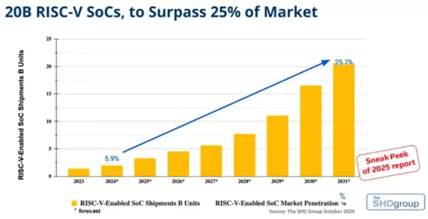 The SHD Group预测,到2030年,全球RISC-V SoC出货量将达162亿颗,市场规模927亿美元,年复合增长率高达47.4%,远超传统架构。其中,AI加 速 器将成为增长最快领域,预计贡献超400亿美元营收。
