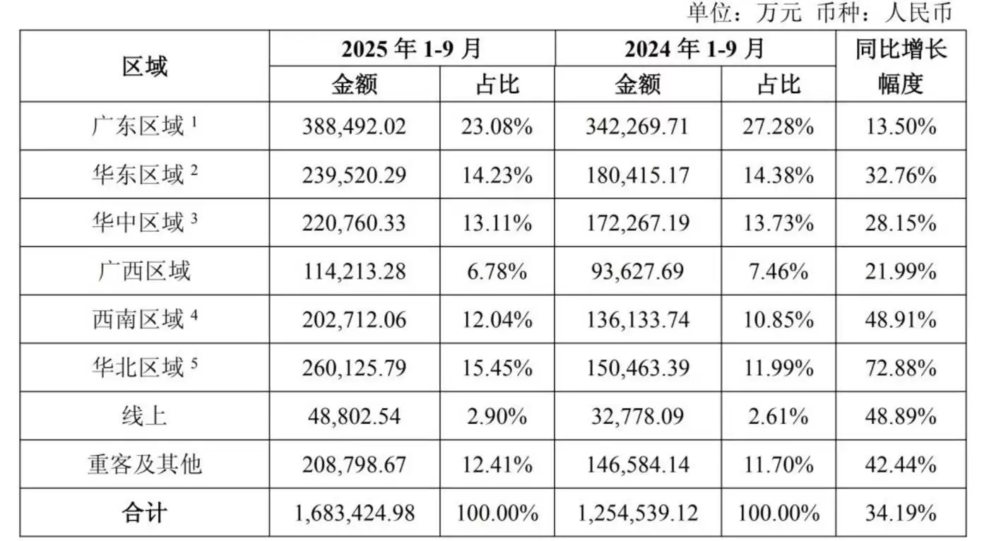 (广东区域增速放缓,华北、西南保持高增速,图:东鹏饮料2025前三季度经营数据公告)