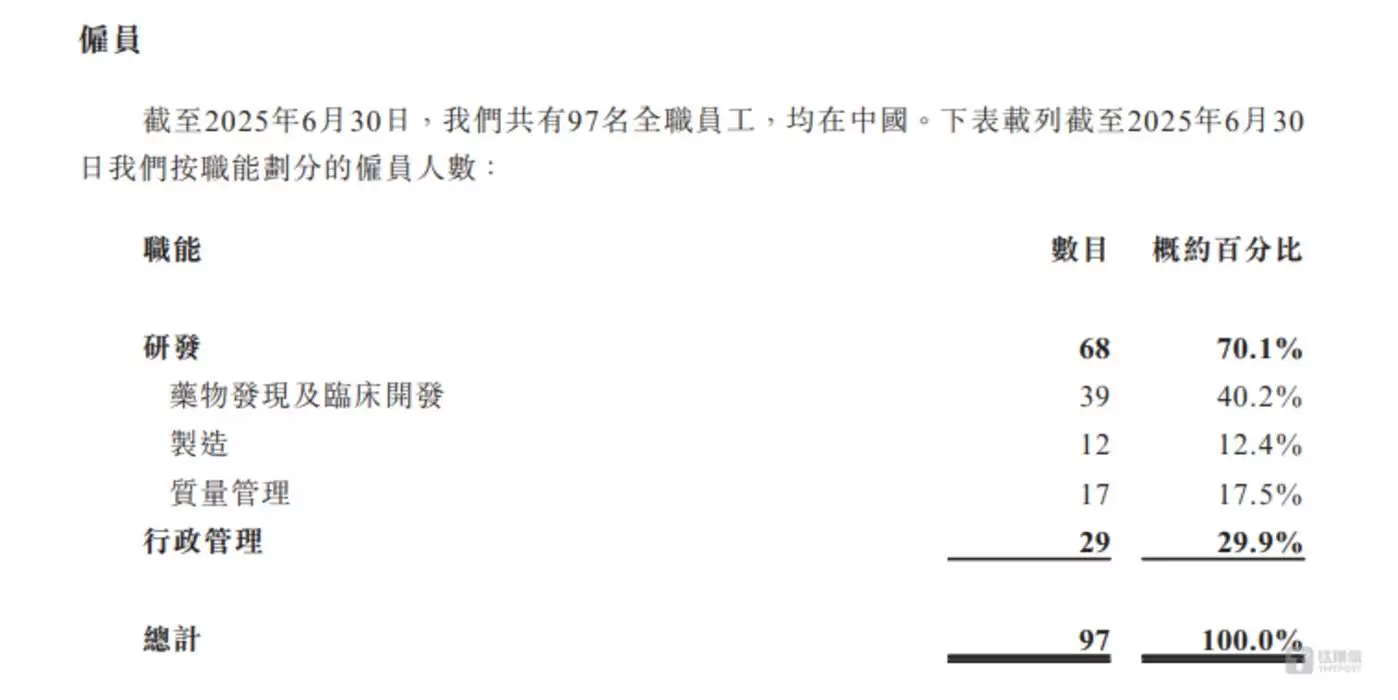 值得注意的是,这家成立已11年的生物科技企业至今仍未实现任何产品的商业化转化,其间累计亏损总额已超过5亿元。持续亏损的核心症结在于高强度的研发投入,这与创新药企普遍存在的"先投入后回报"商业模式本质相同。从团队构成来看,截至招股书签署日,公司97名员工中研发人员占比超过七成,尚未组建商业化销售团队。这种人员配置与创新药企在产品临近上市阶段通常会提前布局销售渠道的行业惯例形成鲜明反差。公司何时能够迎来盈利拐点,仍需市场持续关注。