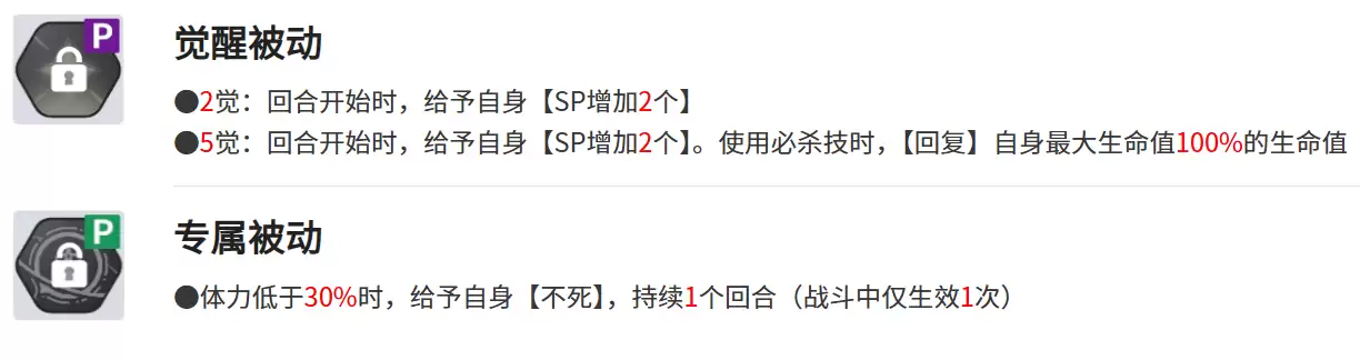觉醒被动技能分为2觉和5觉两个阶段。2觉能为自身附加2点SP,而5觉则在2点SP的基础上,让兰吉尔斯在使用必杀技后能够恢复100%的最大生命值。专属被动技能则是在生命值低于30%时自动触发,赋予自身不死状态的特殊保护效果。