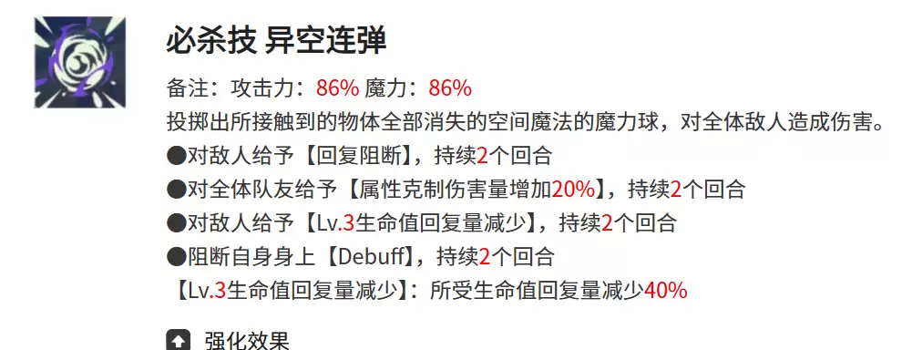 异空连弹作为兰吉尔斯的必杀技,拥有86%的攻击与魔力加成。发动时,他会向敌方投掷能够消除一切接触物的空间魔力球。这些魔力球在命中敌人时,不仅能附加回复阻断和生命回复量削减的双重效果,还能为我方全体队友提供20%的属性克制伤害提升。最关键的是,该技能还能直接将自身的减益效果转化为阻断状态。
