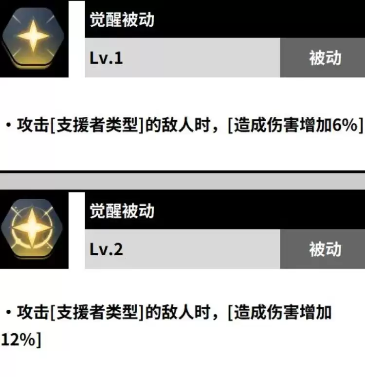 觉醒被动技能主要在戈登攻击支援者类型的敌人时会被触发,触发后能够给敌人造成的伤害再增加6%。当觉醒被动技能升级到2级后,在对支援型的敌人进行攻击时,所造成的伤害会增加12%。
