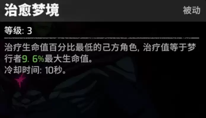 首先是治疗梦境这个被动技能,它能为生命值偏低的队友进行恢复,治疗量相当于梦行者最大生命值。技能冷却时间为十秒,同时还有自动治疗的效果——治疗量会与自身生命值挂钩。除此之外,他还拥有攻击类技能,比如扭曲梦境这个技能可以造成特殊伤害。这个终极技能可以持续释放能量,造成大范围消耗,随后就是梦之力:这个技能能不断叠加伤害,增加单次技能效果,直到战绩全部消失为止,并且对终极技能免疫,还能提升单个角色释放梦境的能力。