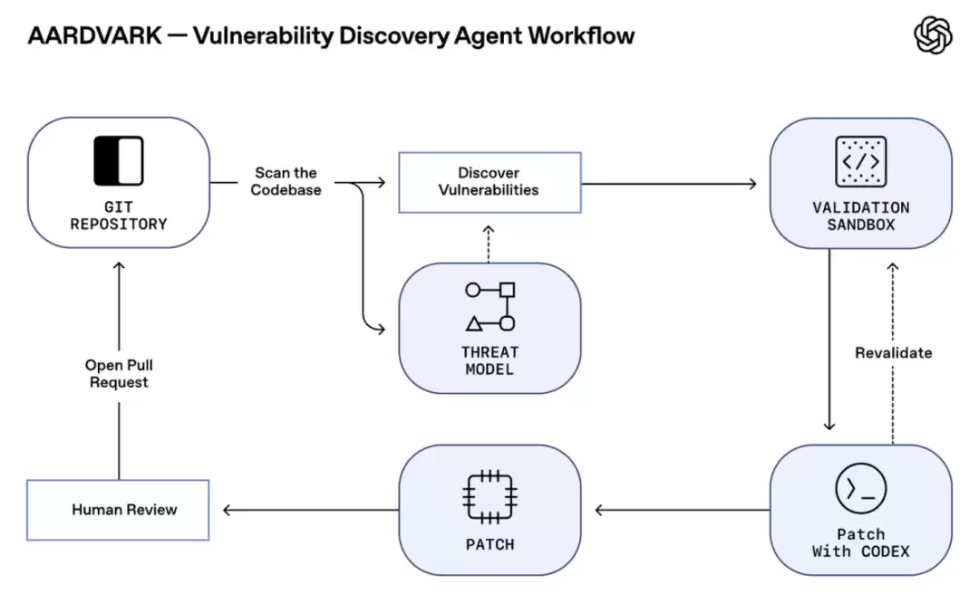 具体来说,它的工作流程从Git仓库出发,依次经历:威胁建模→漏洞发现→沙箱验证→Codex修复→人工复核→提交拉取请求。