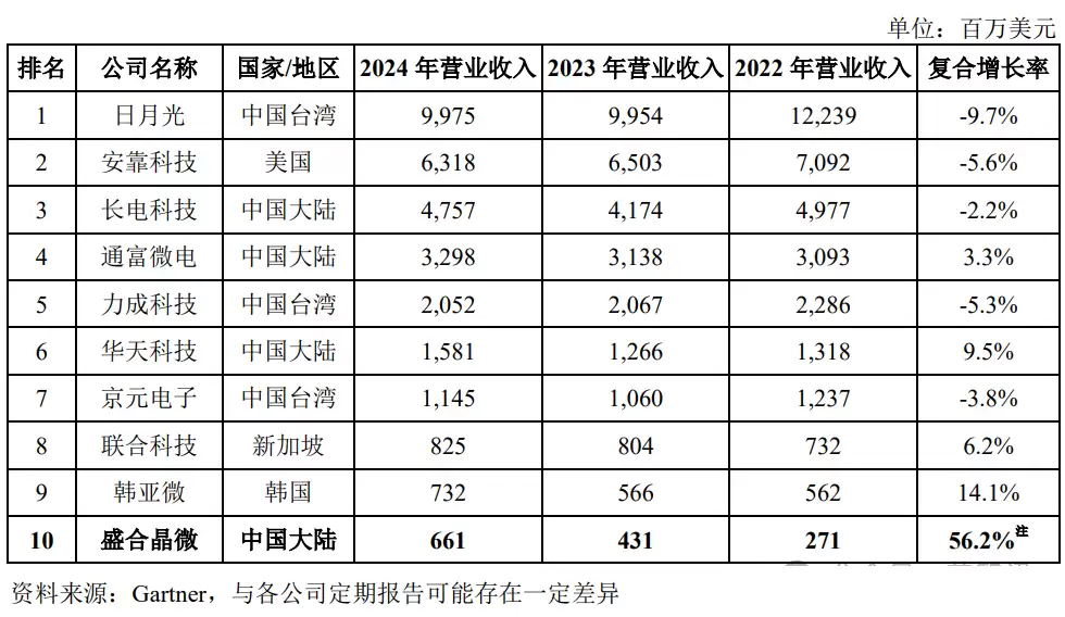 盛合晶微是全球范围内营收规模较大且增长较快的集成电路先进封测企业。根据Gartner的统计,2024年度,公司是全球第十大、境内第四大封测企业,且公司2024年度至2024年度营业收入的复合增长率在全球前十大企业中位居第一。