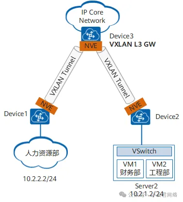 为实现工程部门向Server2的成功迁移,可通过VXLAN技术实现。VXLAN作为基于MAC in UDP的网络虚拟化技术,只要底层物理网络支持IP转发,即可构建跨越物理边界的大规模二层网络。