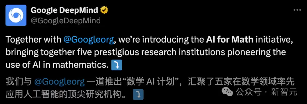 谷歌DeepMind再出重拳,集结全球五大顶尖机构,以AI之力直指数学界圣杯!同时,陶哲轩也发出冷静警示:须警惕AI滥用带来的潜在风险。 今天,谷歌DeepMind重磅发起「AI赋能数学计划」,集结