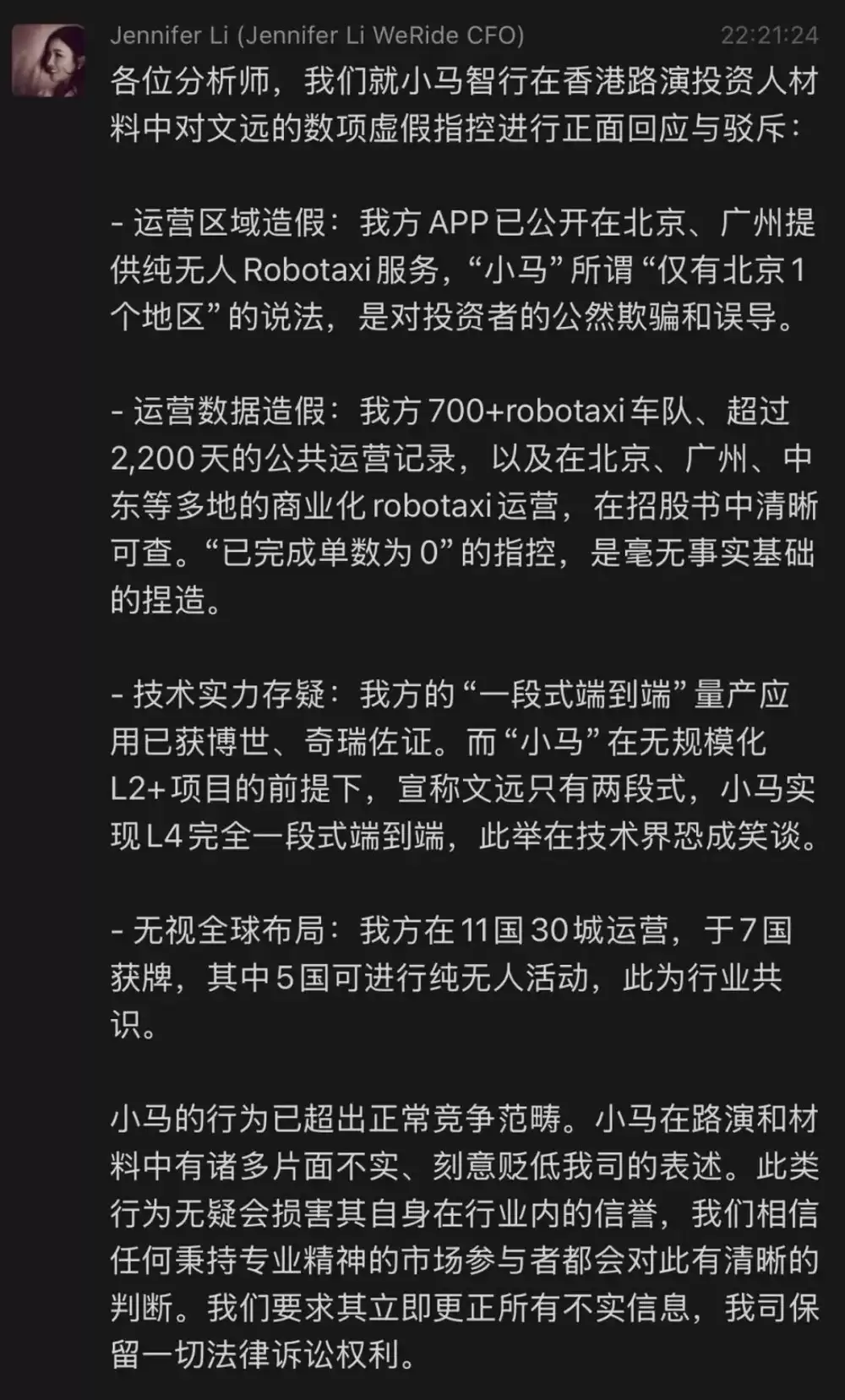 10月31日消息,据文远知行CFO李璇在分析师群中透露,小马智行在面向香港投资人的路演材料中,存在对公司的不实数据指控。10月30日晚间,李璇就此作出正式回应,严正驳斥相关说法。
