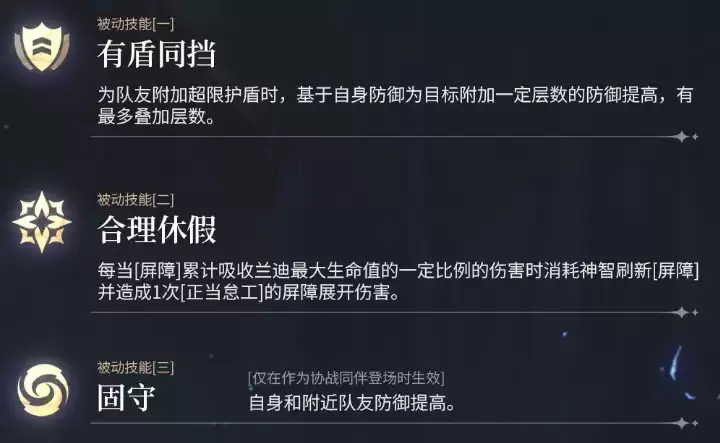兰迪在游戏中属于雷属性角色,主打防御定位,通常配置在队伍中承担防护任务。他的核心特质之一在于带有反差感的设计,因此在战斗演出方面显得比较丰富。他的主动技能附带了屏障效果,可以用来吸收伤害并保护队友,甚至还能配合控制类队伍完成战术目标。