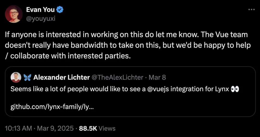 “我们期待看到Vue在Lynx上的应用。欢迎提交PR!”